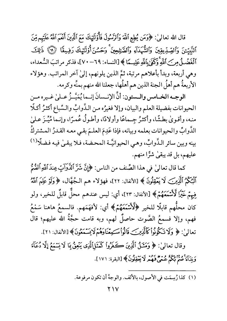 كما قال تعالى في هذا الصِّنف من الناس: {إِنَّ شَرَّ الدَّوَابِّ عِنْدَ اللَّهِ الصُّمُّ الْبُكْمُ الَّذِينَ لَا يَعْقِلُونَ} [الأنفال: ٢٢]، فهؤلاء هم الجُهَّال، {وَلَوْ عَلِمَ اللَّهُ فِيهِمْ خَيْرًا لَأَسْمَعَهُمْ} [الأنفال: ٢٣]، أي: ليس عندهم محلٌّ قابلٌ للخير، ولو كان محلُّهم قابلًا للخير {لَأَسْمَعَهُمْ} أي: لأفهَمَهم. فالسمعُ هاهنا سَمْعُ فهم، وإلا فسمعُ الصَّوت حاصلٌ لهم، وبه قامت حجَّةُ الله عليهم؛ قال تعالى: {وَلَا تَكُونُوا كَالَّذِينَ قَالُوا سَمِعْنَا وَهُمْ لَا يَسْمَعُونَ} [الأنفال: ٢١].