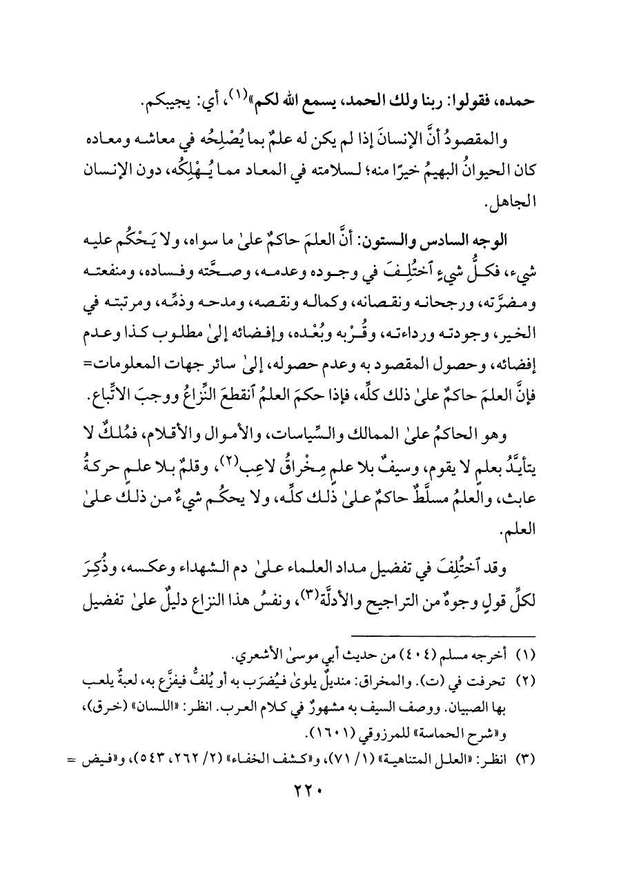 وقد اختُلِفَ في تفضيل مداد العلماء على دم الشهداء وعكسه، وذُكِرَ لكلِّ قولٍ وجوهٌ من التراجيح والأدلَّة (¬٣)، ونفسُ هذا النزاع دليلٌ على تفضيل