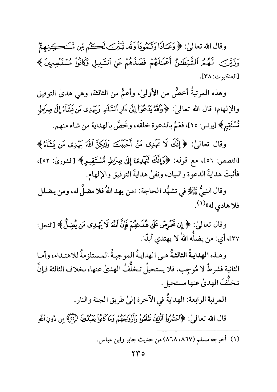 وقال تعالى: {إِنَّكَ لَا تَهْدِي مَنْ أَحْبَبْتَ وَلَكِنَّ اللَّهَ يَهْدِي مَنْ يَشَاءُ} [القصص: ٥٦]، مع قوله: {وَإِنَّكَ لَتَهْدِي إِلَى صِرَاطٍ مُسْتَقِيمٍ} [الشورى: ٥٢]، فأثبتَ هدايةَ الدعوة والبيان، ونفى هدايةَ التوفيق والإلهام. وقال النبيُّ - صلى الله عليه وسلم - في تشهُّد الحاجة: «من يهد اللهُ فلا مضلَّ له، ومن يضلل فلا هادي له» (¬١).