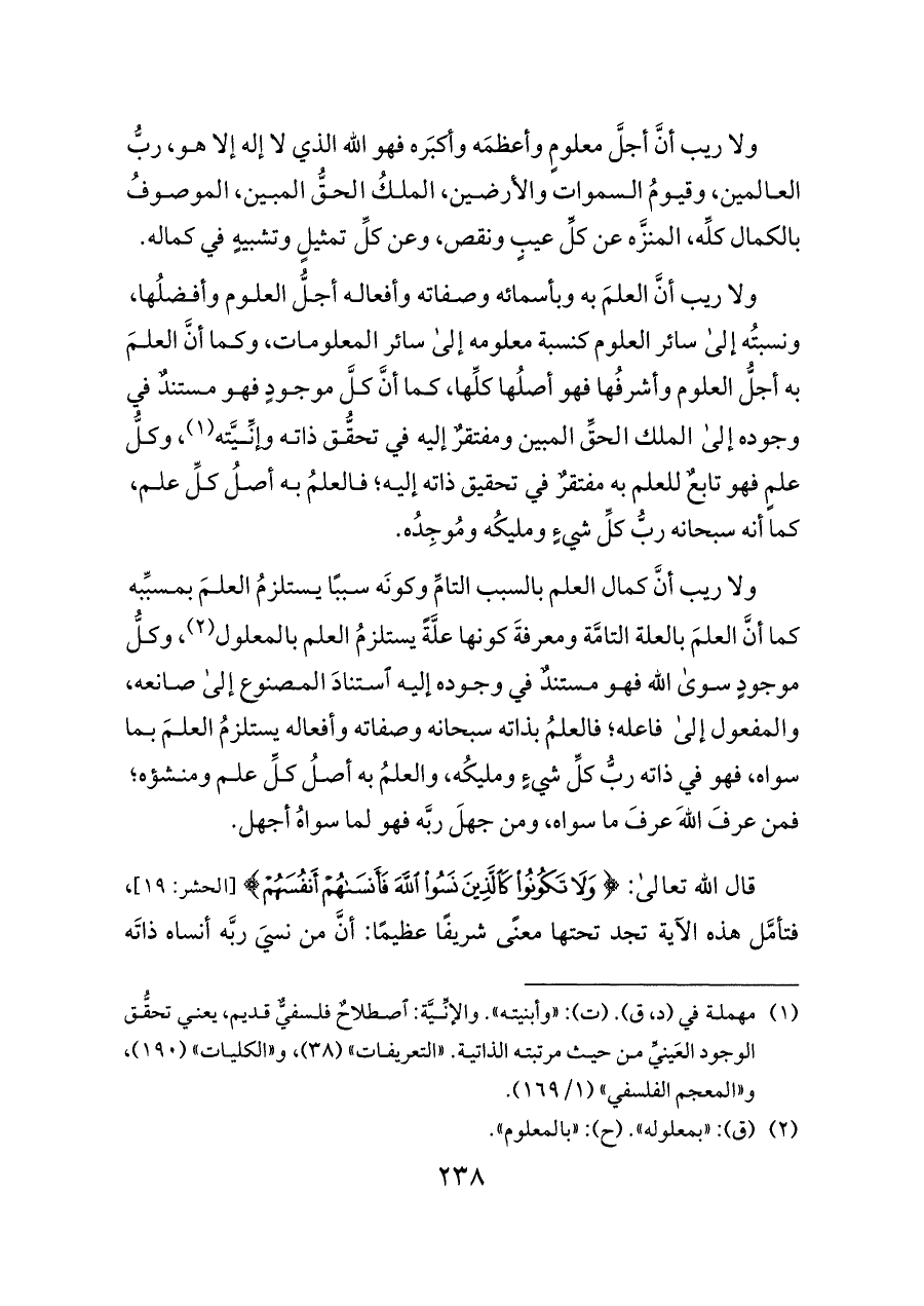 ولا ريب أنَّ أجلَّ معلومٍ وأعظمَه وأكبَره فهو الله الذي لا إله إلا هو، ربُّ العالمين، وقيومُ السموات والأرضين، الملكُ الحقُّ المبين، الموصوفُ بالكمال كلِّه، المنزَّه عن كلِّ عيبٍ ونقص، وعن كلِّ تمثيلٍ وتشبيهٍ في كماله.