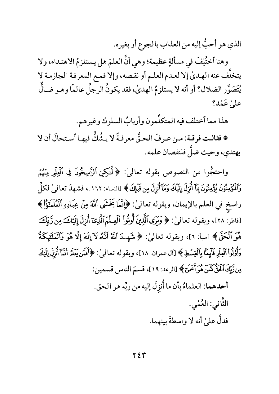 وهنا اختُلِفَ في مسألةٍ عظيمة؛ وهي أنَّ العلمَ هل يستلزمُ الاهتداء، ولا يتخلَّف عنه الهدى إلا لعدم العلم أو نقصه، وإلا فمع المعرفة الجازمة لا يُتَصَوَّر الضلال؟ أو أنه لا يستلزمُ الهدى، فقد يكونُ الرجلُ عالمًا وهو ضالٌّ على عَمْد؟