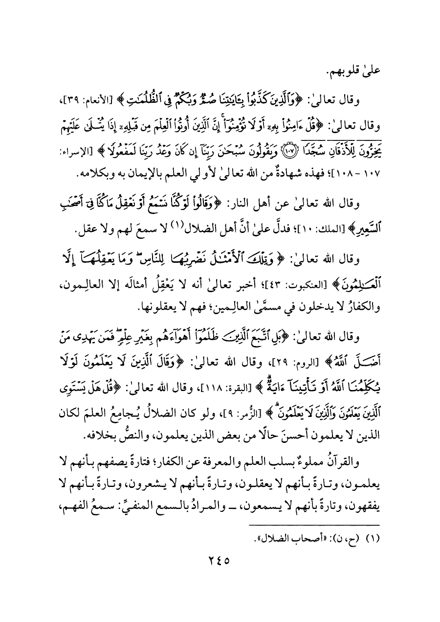 وقال الله تعالى: {بَلِ اتَّبَعَ الَّذِينَ ظَلَمُوا أَهْوَاءَهُمْ بِغَيْرِ عِلْمٍ فَمَنْ يَهْدِي مَنْ أَضَلَّ اللَّهُ} [الروم: ٢٩]، وقال الله تعالى: {وَقَالَ الَّذِينَ لَا يَعْلَمُونَ لَوْلَا يُكَلِّمُنَا اللَّهُ أَوْ تَأْتِينَا آيَةٌ} [البقرة: ١١٨]، وقال الله تعالى: {قُلْ هَلْ يَسْتَوِي الَّذِينَ يَعْلَمُونَ وَالَّذِينَ لَا يَعْلَمُونَ} [الزُّمر: ٩]، ولو كان الضلالُ يُجامِعُ العلمَ لكان الذين لا يعلمون أحسنَ حالًا من بعض الذين يعلمون، والنصُّ بخلافه.