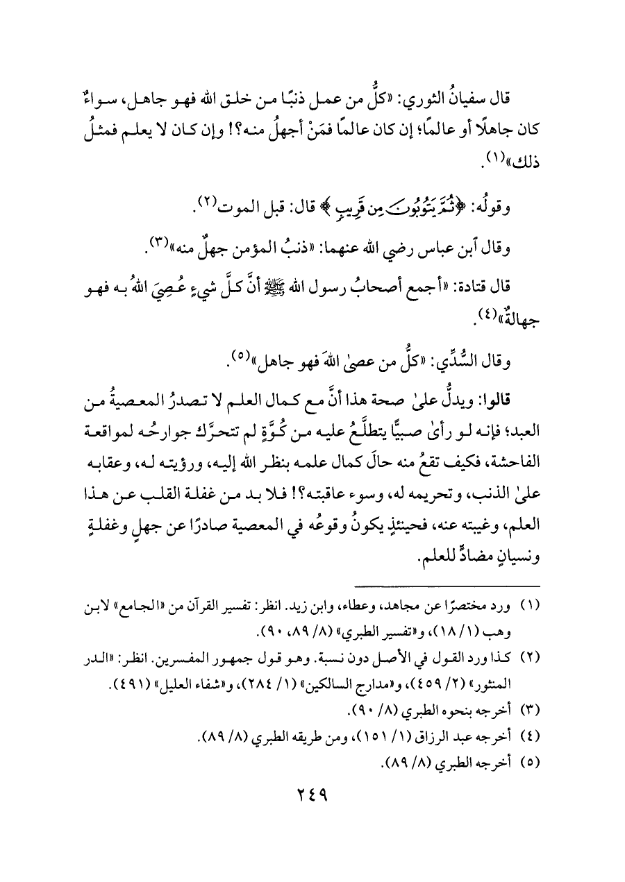 قال سفيانُ الثوري: «كلُّ من عمل ذنبًا من خلق الله فهو جاهل، سواءٌ كان جاهلًا أو عالمًا؛ إن كان عالمًا فمَنْ أجهلُ منه؟! وإن كان لا يعلم فمثلُ ذلك» (¬١).