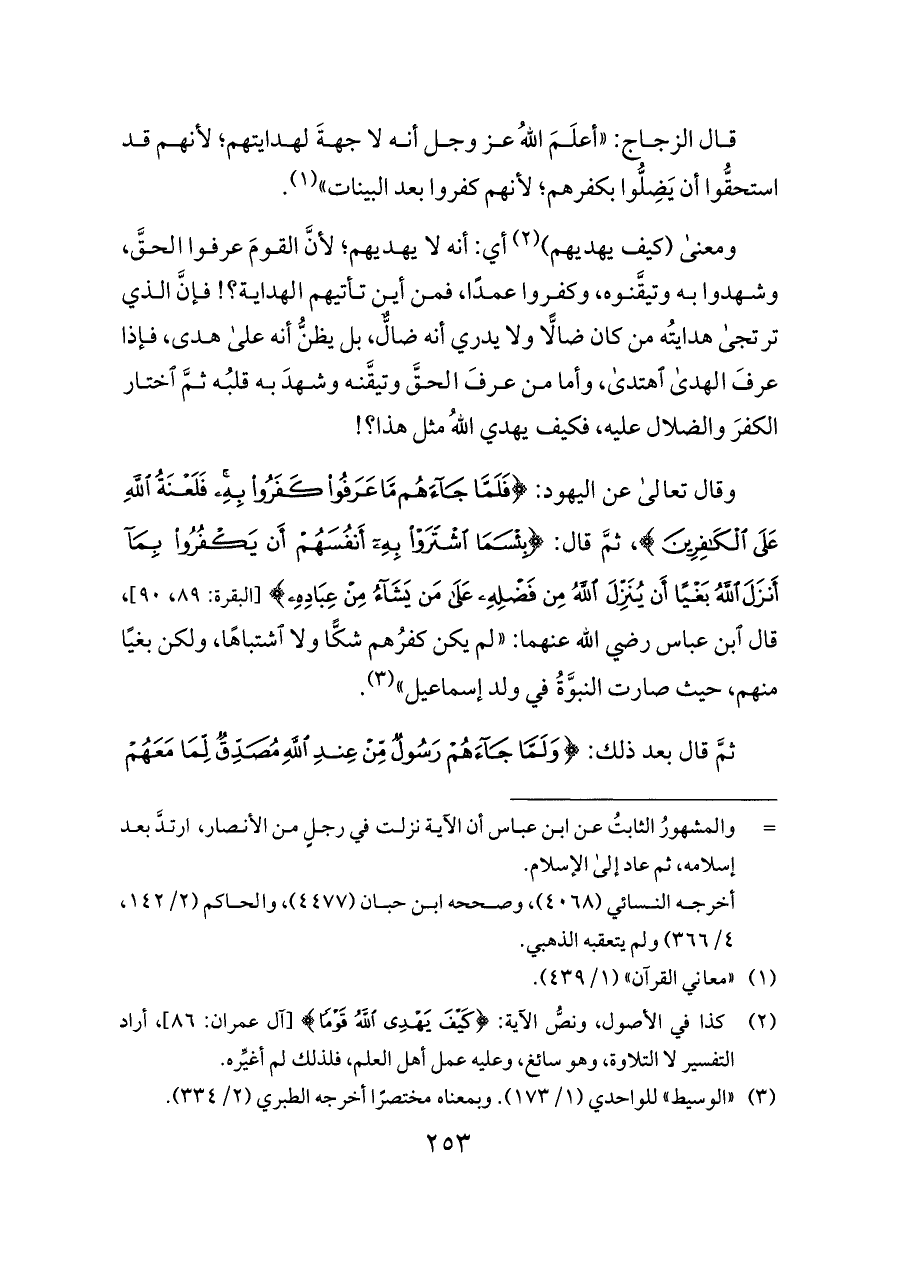 (¬٢) كذا في الأصول، ونصُّ الآية: {كَيْفَ يَهْدِي اللَّهُ قَوْمًا} [آل عمران: ٨٦]، أراد التفسير لا التلاوة، وهو سائغ، وعليه عمل أهل العلم، فلذلك لم أغيِّره.
