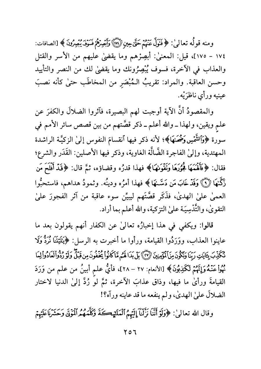 والمقصودُ أنَّ الآية أوجبت لهم البصيرة، فآثروا الضلالَ والكفرَ عن علمٍ ويقين، ولهذا ــ والله أعلم ــ ذكر قصَّتهم من بين قصص سائر الأمم في سورة {وَالشَّمْسِ وَضُحَاهَا}؛ لأنه ذكر فيها انقسامَ النفوس إلى الزكيَّة الراشدة المهتدية، وإلى الفاجرة الضَّالَّة الغاوية، وذكر فيها الأصلين: القَدَر والشرع؛ فقال: {فَأَلْهَمَهَا فُجُورَهَا وَتَقْوَاهَا} فهذا قدرُه وقضاؤه، ثمَّ قال: {قَدْ أَفْلَحَ مَنْ زَكَّاهَا (٩) وَقَدْ خَابَ مَنْ دَسَّاهَا} فهذا أمرُه ودينُه. وثمودُ هداهم، فاستحبُّوا العمى على الهدى، فذَكَر قصَّتَهم ليبيِّن سوء عاقبة من آثر الفجورَ على التقوى، والتَّدْسِيَة على التزكية، والله أعلم بما أراد.
