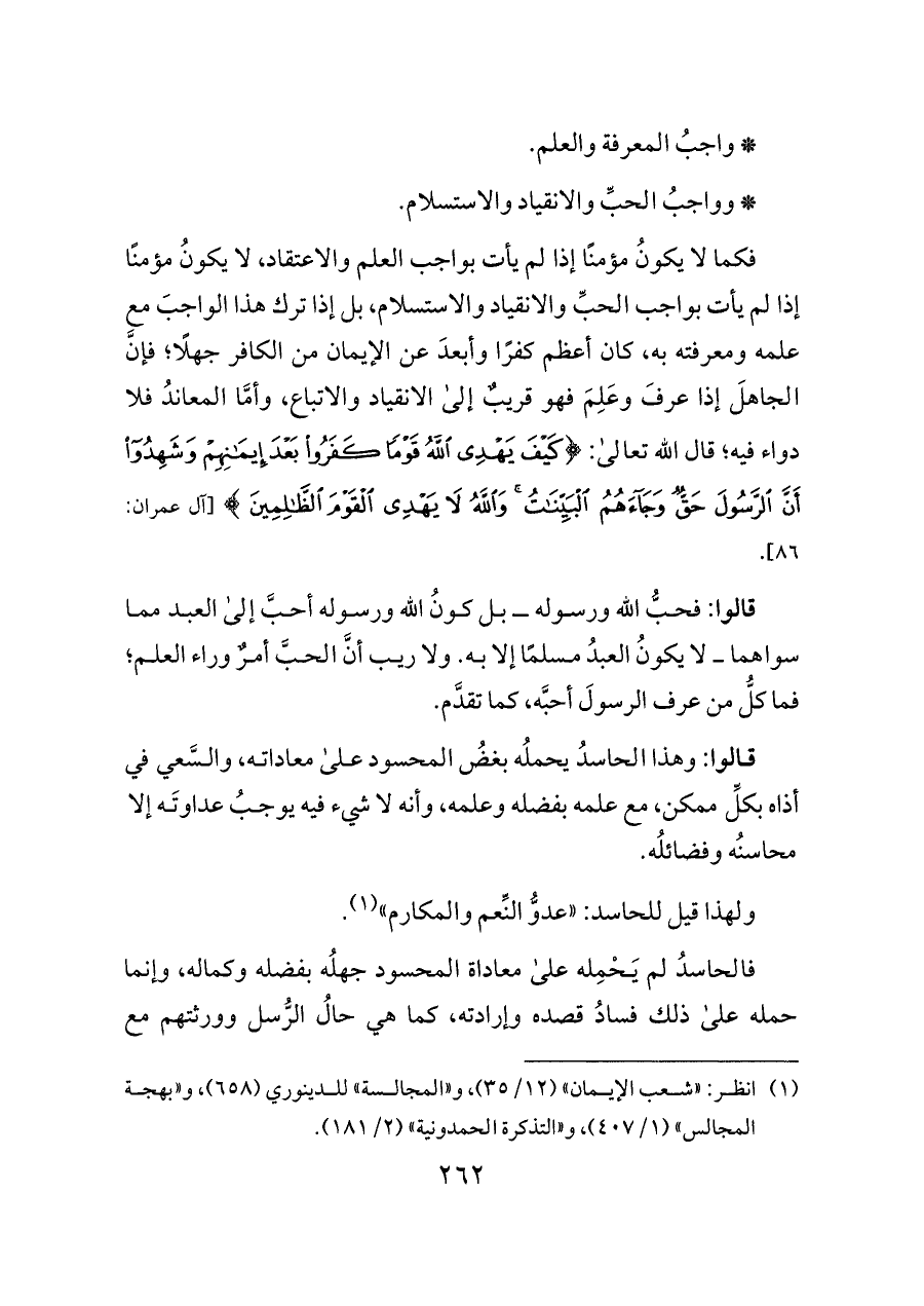 فكما لا يكونُ مؤمنًا إذا لم يأت بواجب العلم والاعتقاد، لا يكونُ مؤمنًا إذا لم يأت بواجب الحبِّ والانقياد والاستسلام، بل إذا ترك هذا الواجبَ مع علمه ومعرفته به، كان أعظم كفرًا وأبعدَ عن الإيمان من الكافر جهلًا؛ فإنَّ الجاهلَ إذا عرفَ وعَلِمَ فهو قريبٌ إلى الانقياد والاتباع، وأمَّا المعاندُ فلا دواء فيه؛ قال الله تعالى: {كَيْفَ يَهْدِي اللَّهُ قَوْمًا كَفَرُوا بَعْدَ إِيمَانِهِمْ وَشَهِدُوا أَنَّ الرَّسُولَ حَقٌّ وَجَاءَهُمُ الْبَيِّنَاتُ وَاللَّهُ لَا يَهْدِي الْقَوْمَ الظَّالِمِينَ} [آل عمران: ٨٦].