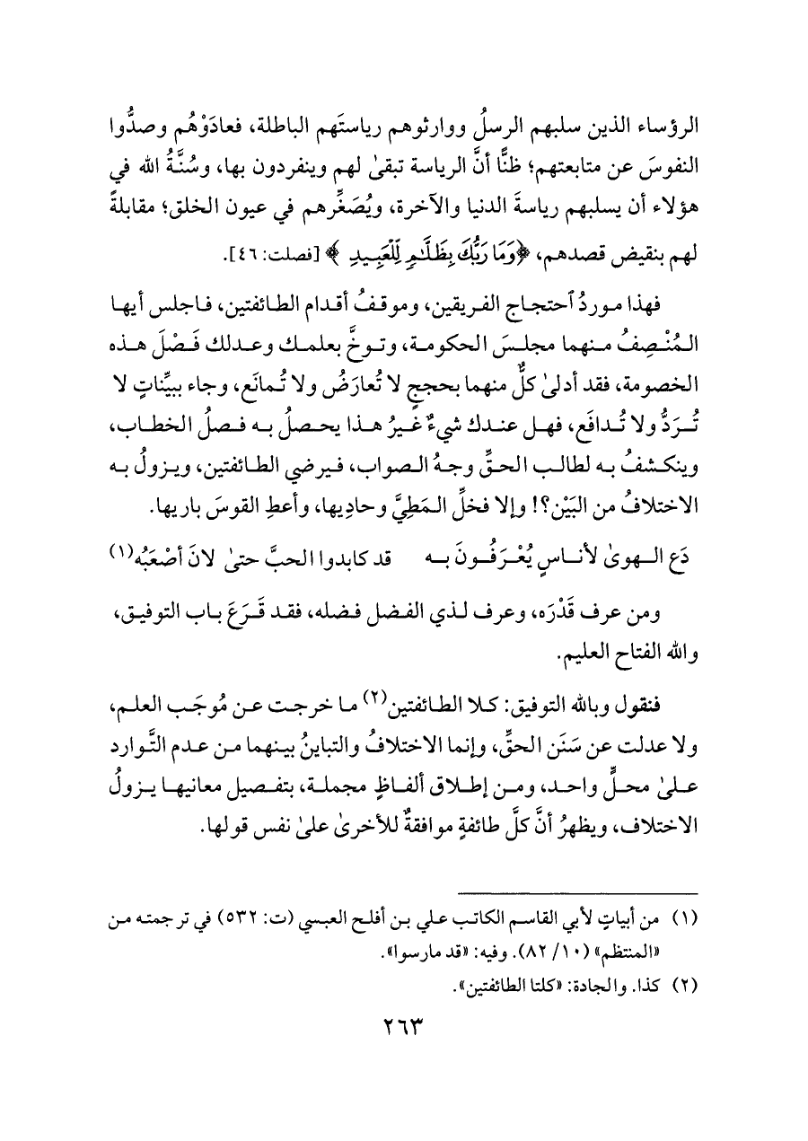 فهذا موردُ احتجاج الفريقين، وموقفُ أقدام الطائفتين، فاجلس أيها المُنْصِفُ منهما مجلسَ الحكومة، وتوخَّ بعلمك وعدلك فَصْلَ هذه الخصومة، فقد أدلى كلٌّ منهما بحججٍ لا تُعارَضُ ولا تُمانَع، وجاء ببيِّناتٍ لا تُرَدُّ ولا تُدافَع، فهل عندك شيءٌ غيرُ هذا يحصلُ به فصلُ الخطاب، وينكشفُ به لطالب الحقِّ وجهُ الصواب، فيرضي الطائفتين، ويزولُ به الاختلافُ من البَيْن؟! وإلا فخلِّ المَطِيَّ وحادِيها، وأعطِ القوسَ باريها.