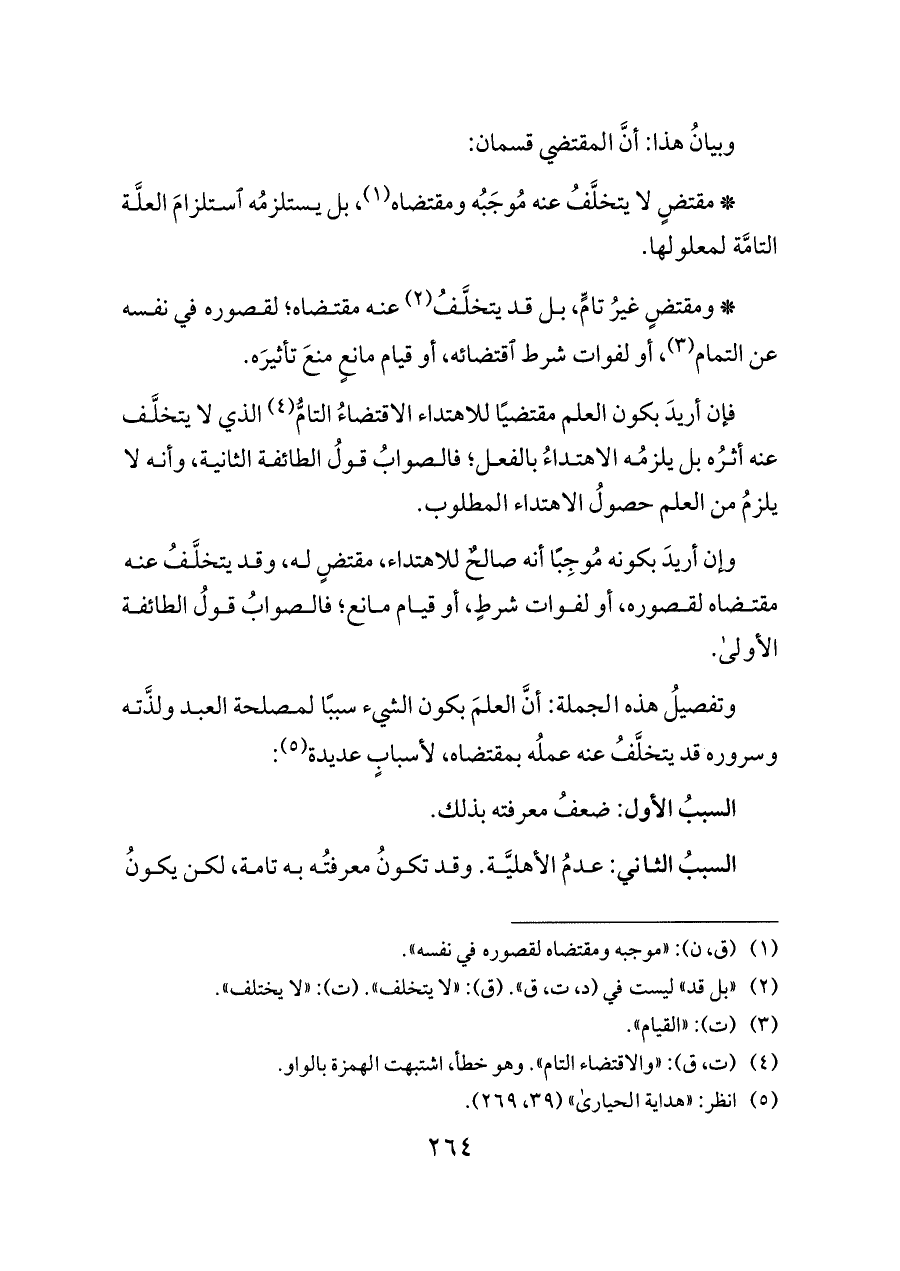 فإن أريدَ بكون العلم مقتضيًا للاهتداء الاقتضاءُ التامُّ (¬٤) الذي لا يتخلَّف عنه أثرُه بل يلزمُه الاهتداءُ بالفعل؛ فالصوابُ قولُ الطائفة الثانية، وأنه لا يلزمُ من العلم حصولُ الاهتداء المطلوب.