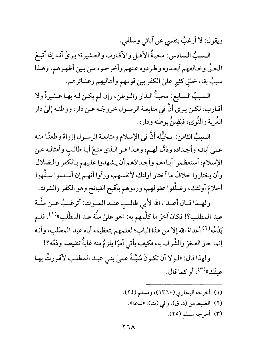 السببُ السابع: محبةُ الدار والوطن، وإن لم يكن له بها عشيرةٌ ولا أقارب، لكن يرى أنَّ في متابعة الرسول خروجَه عن داره ووطنه إلى دار الغُربة والنَّوى، فيَضِنُّ بوطنه وداره.