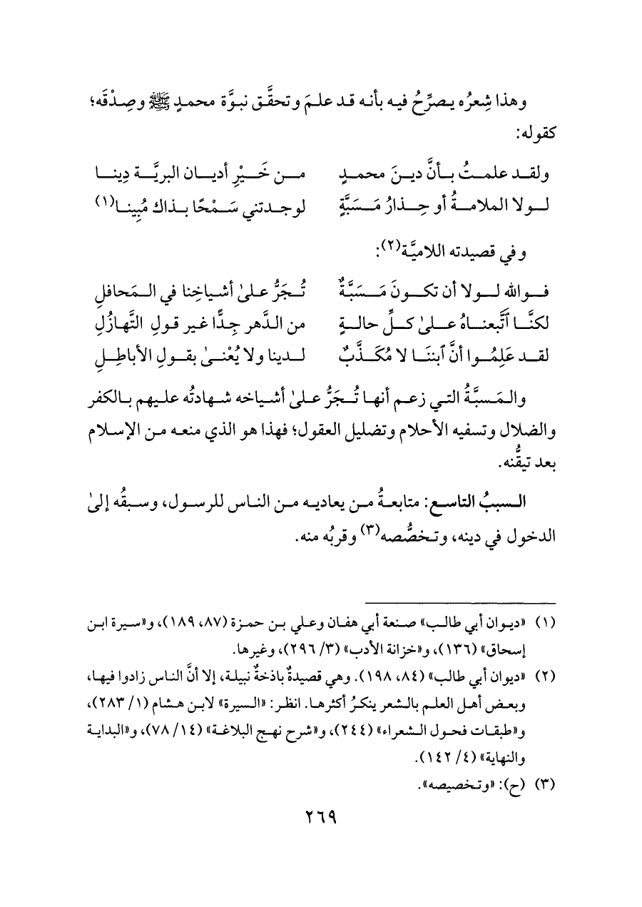 (¬٢) «ديوان أبي طالب» (٨٤، ١٩٨). وهي قصيدةٌ باذخةٌ نبيلة، إلا أنَّ الناس زادوا فيها، وبعض أهل العلم بالشعر ينكرُ أكثرها. انظر: «السيرة» لابن هشام (١/ ٢٨٣)، و «طبقات فحول الشعراء» (٢٤٤)، و «شرح نهج البلاغة» (١٤/ ٧٨)، و «البداية والنهاية» (٤/ ١٤٢).