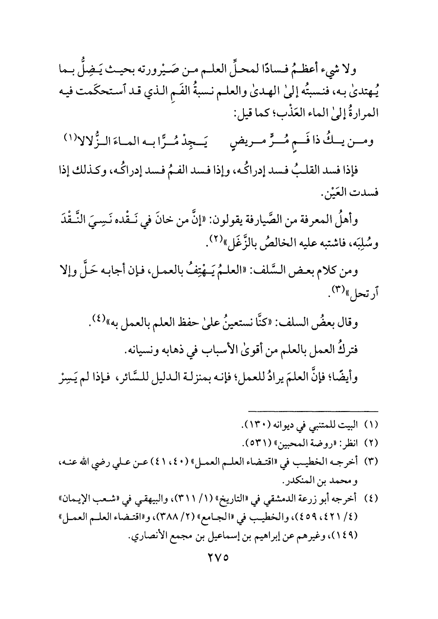 ولا شيء أعظمُ فسادًا لمحلِّ العلم من صَيْرورته بحيث يَضِلُّ بما يُهتدى به، فنسبتُه إلى الهدى والعلم نسبةُ الفَمِ الذي قد استحكَمت فيه المرارةُ إلى الماء العَذْب؛ كما قيل: