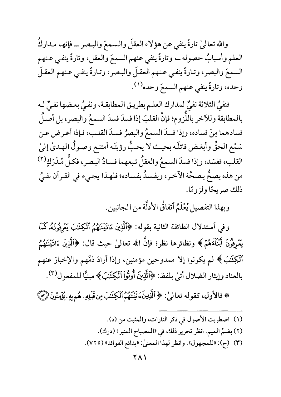 وفي استدلال الطائفة الثانية بقوله: {الَّذِينَ آتَيْنَاهُمُ الْكِتَابَ يَعْرِفُونَهُ كَمَا يَعْرِفُونَ أَبْنَاءَهُمْ} ونظائرها نظر؛ فإنَّ الله تعالى حيث قال: {الَّذِينَ آتَيْنَاهُمُ الْكِتَابَ} لم يكونوا إلا ممدوحين مؤمنين، وإذا أرادَ ذمَّهم والإخبارَ عنهم بالعناد وإيثار الضلال أتى بلفظ: {الَّذِينَ أُوتُوا الْكِتَابَ} مبنيًّا للمفعول (¬٣).