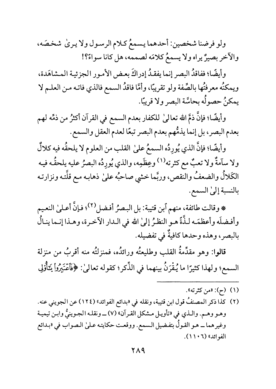 (¬٢) كذا ذكر المصنفُ قول ابن قتيبة، ونقله في «بدائع الفوائد» (١٢٤) عن الجويني عنه. وهو وهم. والذي في «تأويل مشكل القرآن» (٧) ــ ونقله الجوينيُّ وابن تيمية وغيرهما ــ هو القولُ بتفضيل السمع. ووقعت حكايته على الصواب في «بدائع الفوائد» (١١٠٦).