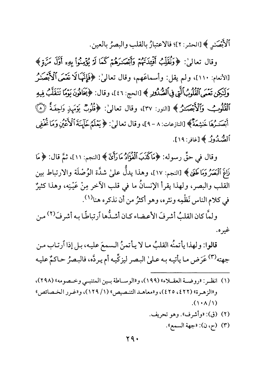 وقال تعالى: {وَنُقَلِّبُ أَفْئِدَتَهُمْ وَأَبْصَارَهُمْ كَمَا لَمْ يُؤْمِنُوا بِهِ أَوَّلَ مَرَّةٍ} [الأنعام: ١١٠]، ولم يقل: وأسماعَهم، وقال تعالى: {فَإِنَّهَا لَا تَعْمَى الْأَبْصَارُ وَلَكِنْ تَعْمَى الْقُلُوبُ الَّتِي فِي الصُّدُورِ} [الحج: ٤٦]، وقال: {يَخَافُونَ يَوْمًا تَتَقَلَّبُ فِيهِ الْقُلُوبُ وَالْأَبْصَارُ} [النور: ٣٧]، وقال تعالى: {قُلُوبٌ يَوْمَئِذٍ وَاجِفَةٌ (٨) أَبْصَارُهَا خَاشِعَةٌ} [النازعات: ٨ - ٩]، وقال تعالى: {يَعْلَمُ خَائِنَةَ الْأَعْيُنِ وَمَا تُخْفِي الصُّدُورُ} [غافر: ١٩].