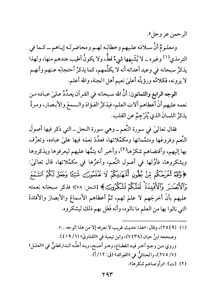 الوجه الرابع والثمانون: أنَّ الله سبحانه في القرآن يعدِّدُ على عباده من نعمه عليهم أنْ أعطاهم آلات العلم، فيذكرُ الفؤادَ والسمعَ والأبصار، ومرةً يذكرُ اللسانَ الذي يُتَرْجِمُ عن القلب.