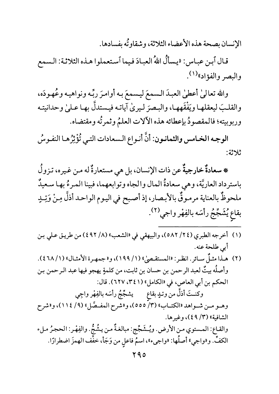 الوجه الخامس والثمانون: أنَّ أنواع السعادات التي تُؤْثِرُها النفوسُ ثلاثة: