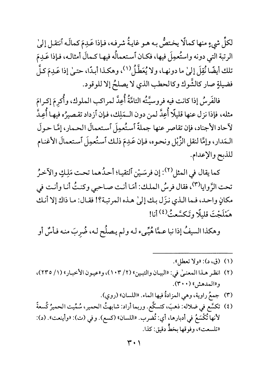 فالفَرسُ إذا كانت فيه فروسيَّتُه التامَّةُ أُعِدَّ لمراكب الملوك، وأُكرِمَ إكرامَ مثله، فإذا نزل عنها قليلًا أُعِدَّ لمن دون المَلِك، فإن ازداد تقصيرُه فيها أُعِدَّ لآحاد الأجناد، فإن تقاصر عنها جملةً استُعمِلَ استعمالَ الحمار، إمَّا حولَ المَدار، وإمَّا لنقل الزِّبْل ونحوه، فإن عَدِمَ ذلك استُعمِلَ استعمالَ الأغنام للذبح والإعدام.