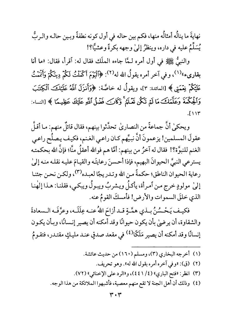 والنبيُّ - صلى الله عليه وسلم - في أول أمره لمَّا جاءه الملَك فقال له: اقرأ، فقال: «ما أنا بقاراء» (¬١)، وفي آخر أمره يقولُ الله له (¬٢): {الْيَوْمَ أَكْمَلْتُ لَكُمْ دِينَكُمْ وَأَتْمَمْتُ عَلَيْكُمْ نِعْمَتِي} [المائدة: ٣]، ويقولُ له خاصَّة: {وَأَنْزَلَ اللَّهُ عَلَيْكَ الْكِتَابَ وَالْحِكْمَةَ وَعَلَّمَكَ مَا لَمْ تَكُنْ تَعْلَمُ وَكَانَ فَضْلُ اللَّهِ عَلَيْكَ عَظِيمًا} [النساء: ١١٣].