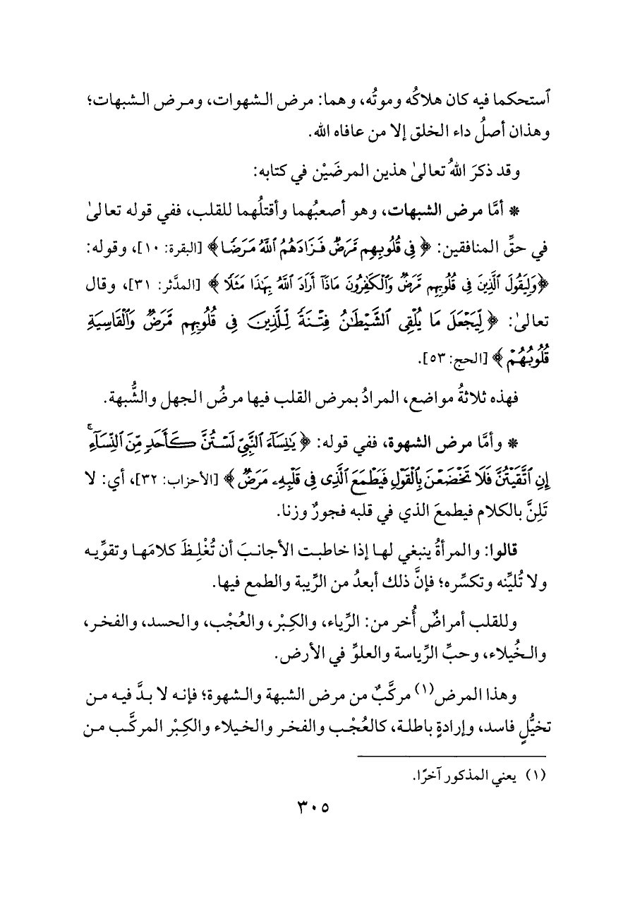 * أمَّا مرض الشبهات، وهو أصعبُهما وأقتلُهما للقلب، ففي قوله تعالى في حقِّ المنافقين: {فِي قُلُوبِهِمْ مَرَضٌ فَزَادَهُمُ اللَّهُ مَرَضًا} [البقرة: ١٠]، وقوله: {وَلِيَقُولَ الَّذِينَ فِي قُلُوبِهِمْ مَرَضٌ وَالْكَافِرُونَ مَاذَا أَرَادَ اللَّهُ بِهَذَا مَثَلًا} [المدَّثر: ٣١]، وقال تعالى: {لِيَجْعَلَ مَا يُلْقِي الشَّيْطَانُ فِتْنَةً لِلَّذِينَ فِي قُلُوبِهِمْ مَرَضٌ وَالْقَاسِيَةِ قُلُوبُهُمْ} [الحج: ٥٣].