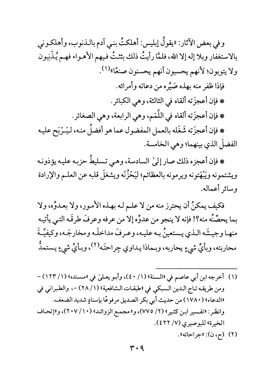 وفي بعض الآثار: «يقولُ إبليس: أهلكتُ بني آدم بالذنوب، وأهلكوني بالاستغفار وبلا إله إلا الله، فلمَّا رأيتُ ذلك بثثتُ فيهم الأهواء فهم يُذْنِبون ولا يتوبون؛ لأنهم يحسبون أنهم يحسنون صنعًا» (¬١).