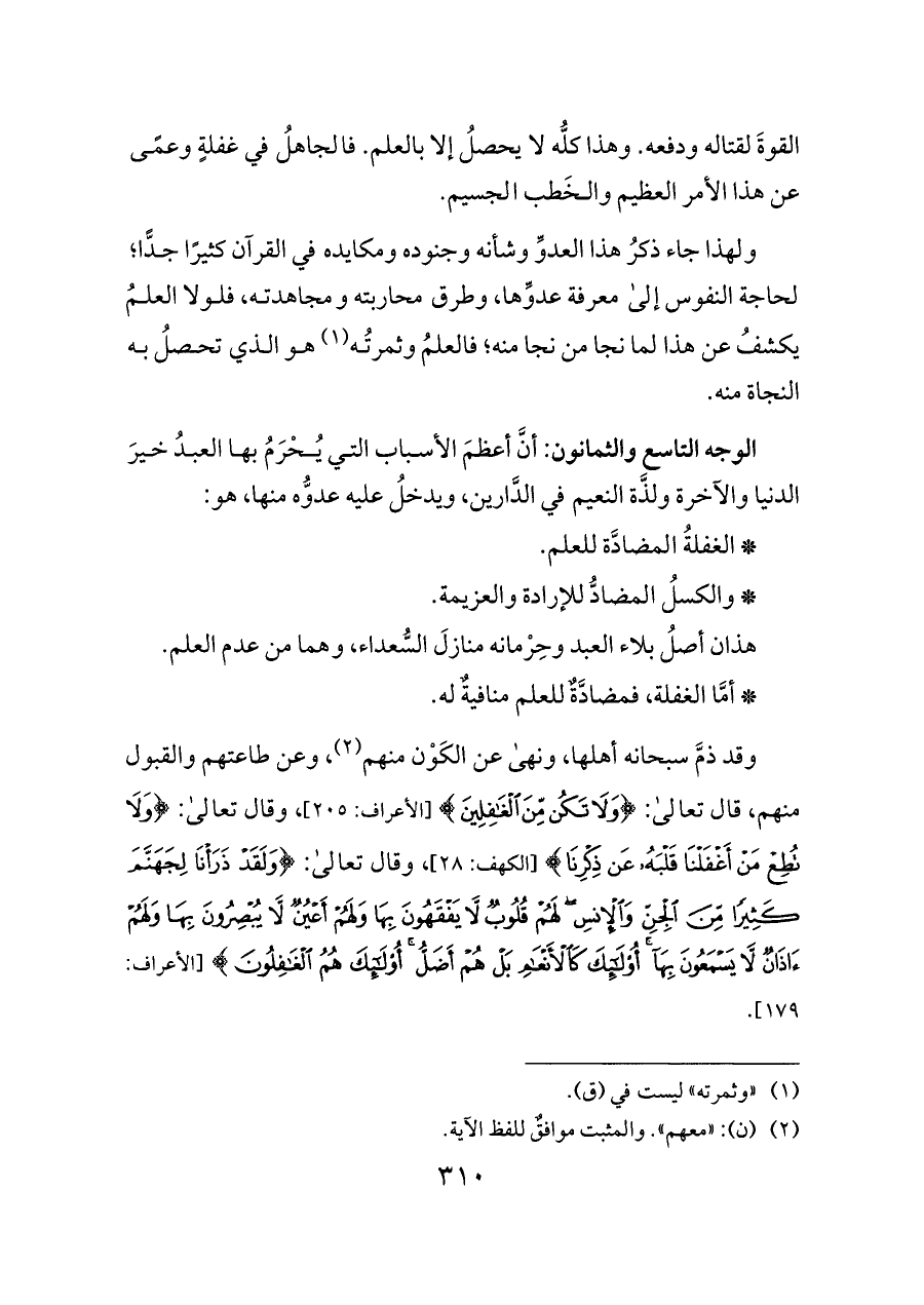 القوةَ لقتاله ودفعه. وهذا كلُّه لا يحصلُ إلا بالعلم. فالجاهلُ في غفلةٍ وعمًى عن هذا الأمر العظيم والخَطب الجسيم.