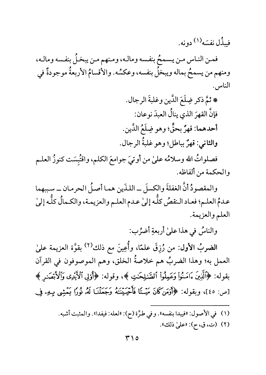 فمن الناس من يسمحُ بنفسه وماله، ومنهم من يبخلُ بنفسه وماله، ومنهم من يسمحُ بماله ويبخلُ بنفسه، وعكسُه. والأقسامُ الأربعةُ موجودةٌ في الناس.