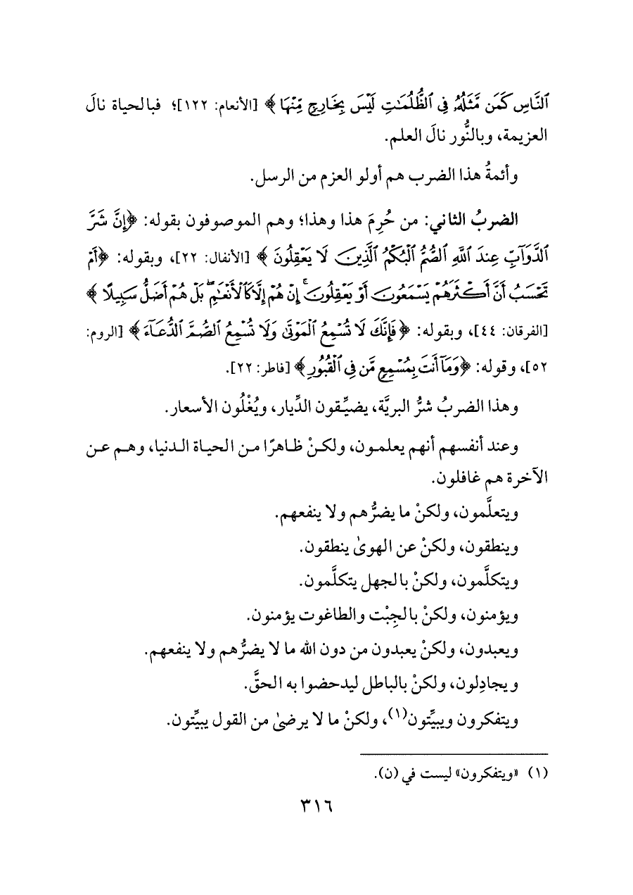 الضربُ الثاني: من حُرِمَ هذا وهذا؛ وهم الموصوفون بقوله: {إِنَّ شَرَّ الدَّوَابِّ عِنْدَ اللَّهِ الصُّمُّ الْبُكْمُ الَّذِينَ لَا يَعْقِلُونَ} [الأنفال: ٢٢]، وبقوله: {أَمْ تَحْسَبُ أَنَّ أَكْثَرَهُمْ يَسْمَعُونَ أَوْ يَعْقِلُونَ إِنْ هُمْ إِلَّا كَالْأَنْعَامِ بَلْ هُمْ أَضَلُّ سَبِيلًا} [الفرقان: ٤٤]، وبقوله: {فَإِنَّكَ لَا تُسْمِعُ الْمَوْتَى وَلَا تُسْمِعُ الصُّمَّ الدُّعَاءَ} [الروم: ٥٢]، وقوله: {وَمَا أَنْتَ بِمُسْمِعٍ مَنْ فِي الْقُبُورِ} [فاطر: ٢٢].