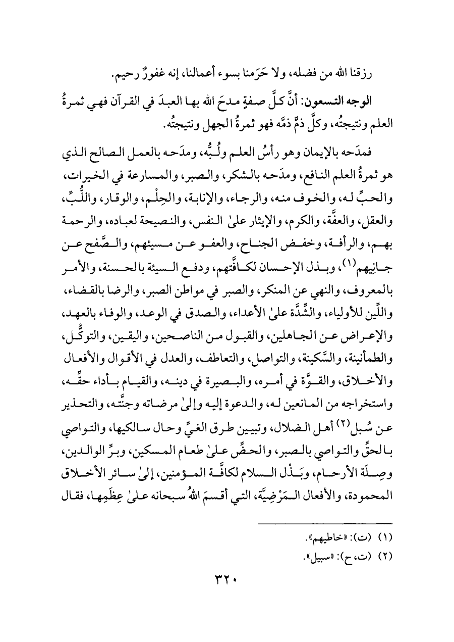 فمدَحه بالإيمان وهو رأسُ العلم ولُبُّه، ومدَحه بالعمل الصالح الذي هو ثمرةُ العلم النافع، ومدَحه بالشكر، والصبر، والمسارعة في الخيرات، والحبِّ له، والخوف منه، والرجاء، والإنابة، والحِلْم، والوقار، واللُّبِّ، والعقل، والعفَّة، والكرم، والإيثار على النفس، والنصيحة لعباده، والرحمة بهم، والرأفة، وخفض الجناح، والعفو عن مسيئهم، والصَّفح عن جانِيهم (¬١)، وبذل الإحسان لكافَّتهم، ودفع السيئة بالحسنة، والأمر بالمعروف، والنهي عن المنكر، والصبر في مواطن الصبر، والرضا بالقضاء، واللِّين للأولياء، والشِّدَّة على الأعداء، والصدق في الوعد، والوفاء بالعهد، والإعراض عن الجاهلين، والقبول من الناصحين، واليقين، والتوكُّل، والطمأنينة، والسَّكينة، والتواصل، والتعاطف، والعدل في الأقوال والأفعال والأخلاق، والقوَّة في أمره، والبصيرة في دينه، والقيام بأداء حقِّه، واستخراجه من المانعين له، والدعوة إليه وإلى مرضاته وجنَّته، والتحذير عن سُبل (¬٢) أهل الضلال، وتبيين طرق الغيِّ وحال سالكيها، والتواصي بالحقِّ والتواصي بالصبر، والحضِّ على طعام المسكين، وبرِّ الوالدين، وصِلَة الأرحام، وبَذْل السلام لكافَّة المؤمنين، إلى سائر الأخلاق المحمودة، والأفعال المَرْضِيَّة، التي أقسمَ اللهُ سبحانه على عِظَمِها، فقال