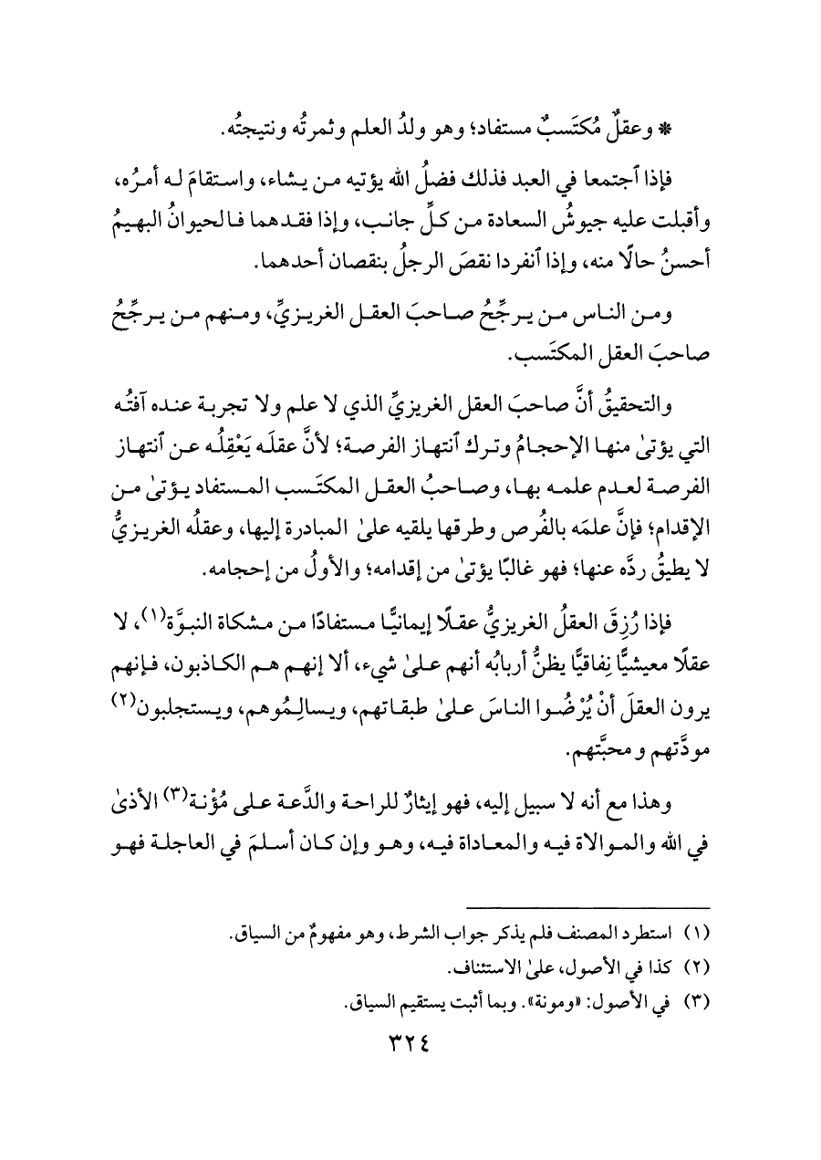 فإذا رُزِقَ العقلُ الغريزيُّ عقلًا إيمانيًّا مستفادًا من مشكاة النبوَّة (¬١)، لا عقلًا معيشيًّا نِفاقيًّا يظنُّ أربابُه أنهم على شيء، ألا إنهم هم الكاذبون، فإنهم يرون العقلَ أنْ يُرْضُوا الناسَ على طبقاتهم، ويسالِمُوهم، ويستجلبون (¬٢) مودَّتهم ومحبَّتهم.