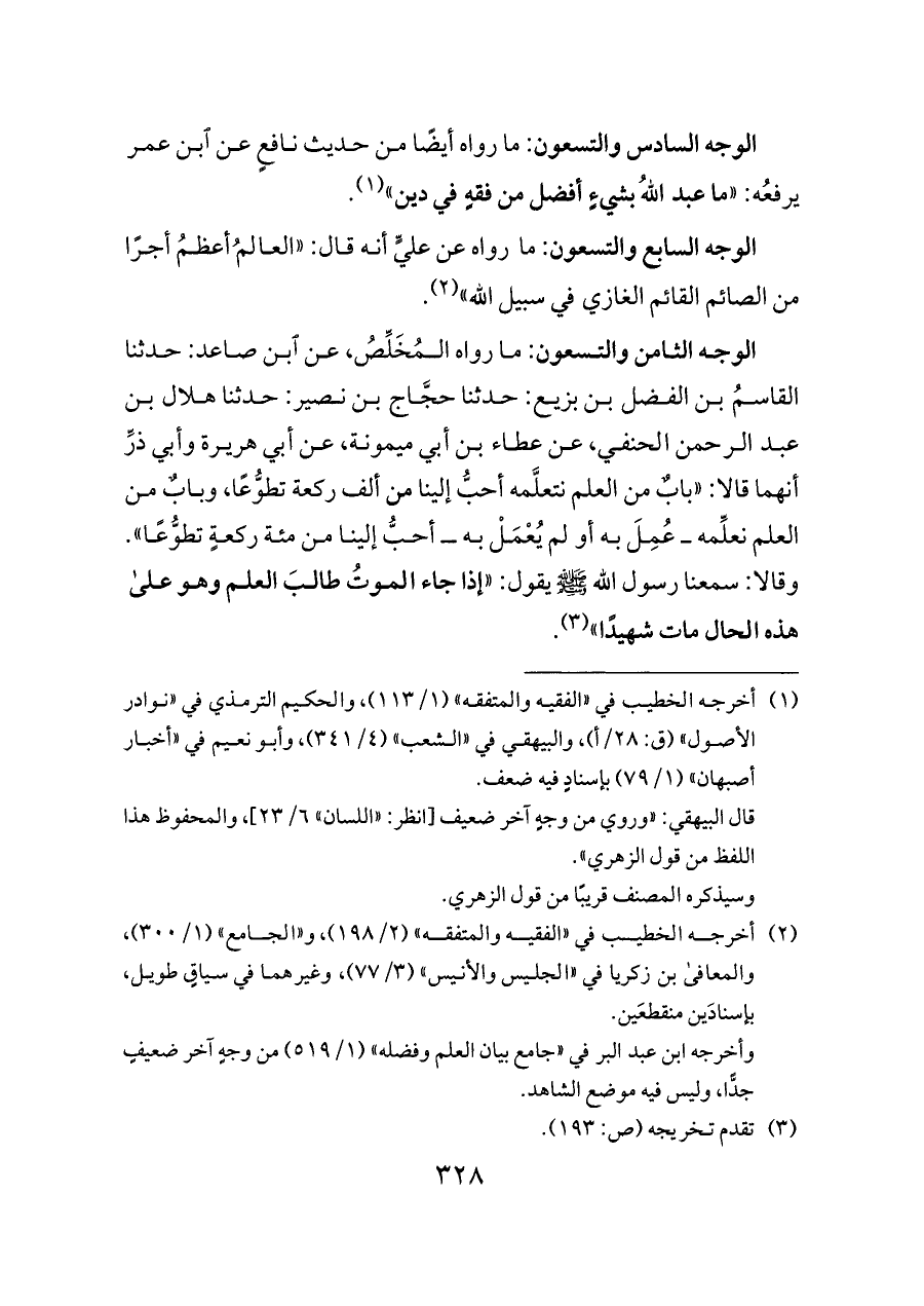 الوجه السابع والتسعون: ما رواه عن عليٍّ أنه قال: «العالمُ أعظمُ أجرًا من الصائم القائم الغازي في سبيل الله» (¬٢).