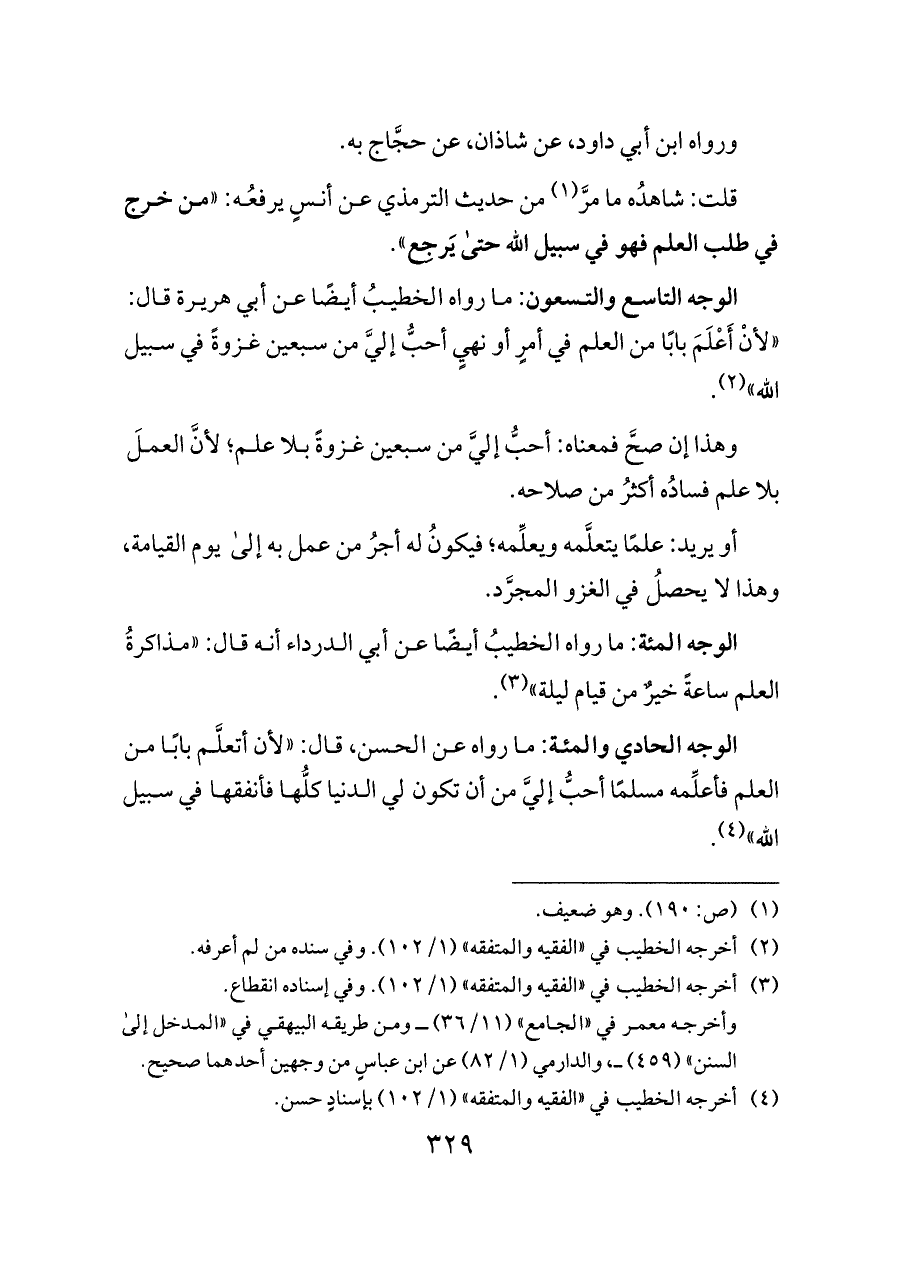 الوجه التاسع والتسعون: ما رواه الخطيبُ أيضًا عن أبي هريرة قال: «لأنْ أَعْلَمَ بابًا من العلم في أمرٍ أو نهيٍ أحبُّ إليَّ من سبعين غزوةً في سبيل الله» (¬٢).