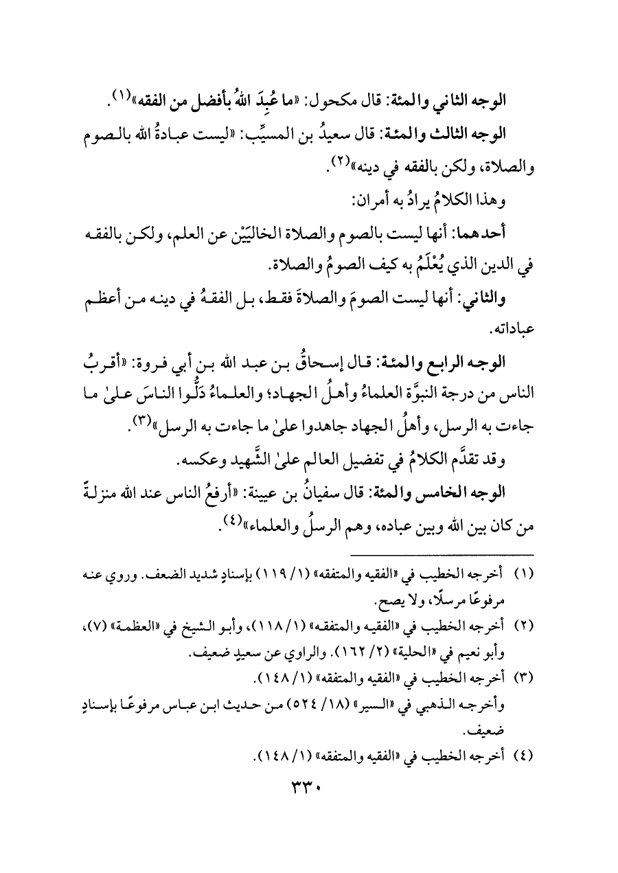 الوجه الثاني والمئة: قال مكحول: «ما عُبِدَ اللهُ بأفضل من الفقه» (¬١).