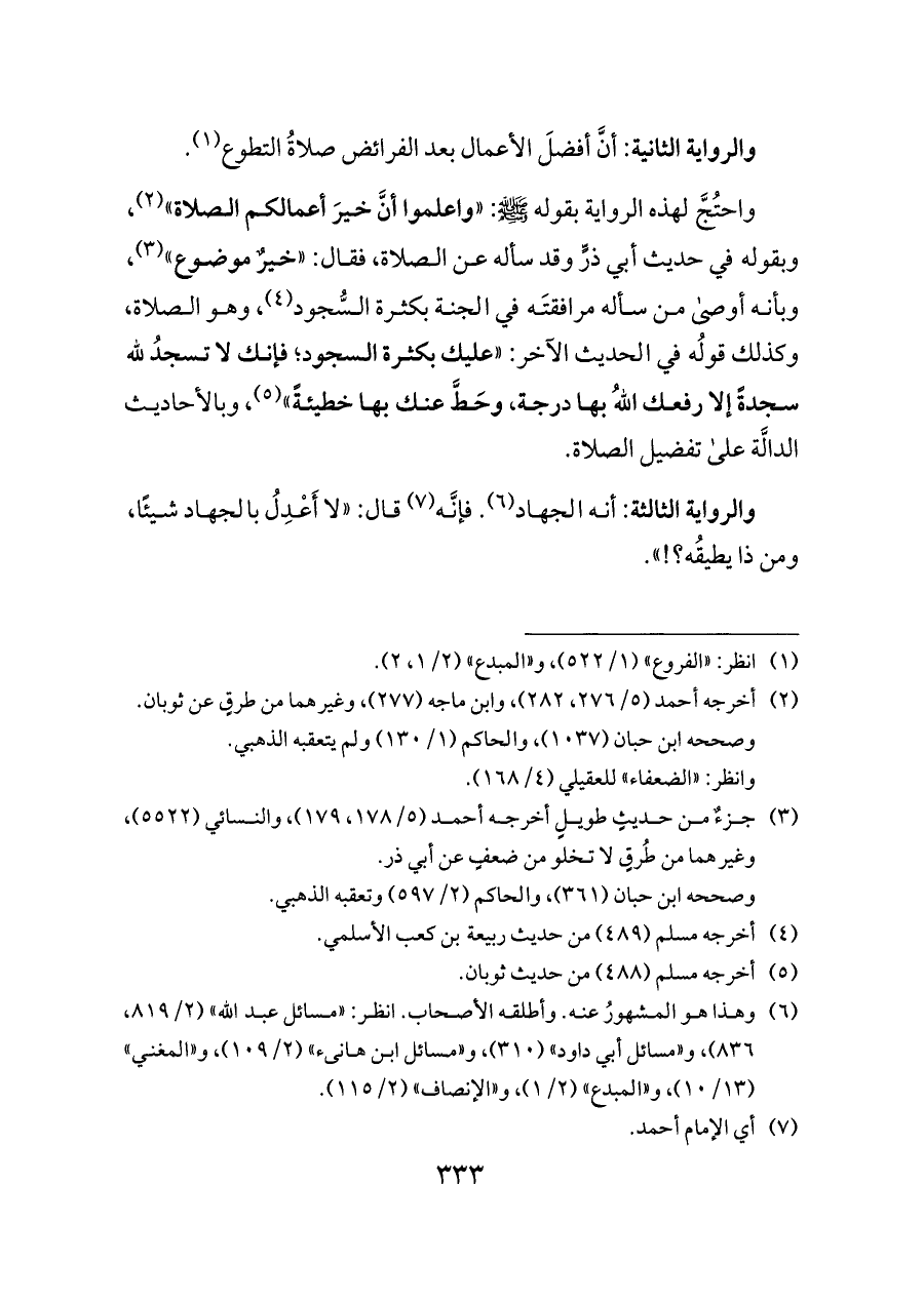 والرواية الثانية: أنَّ أفضلَ الأعمال بعد الفرائض صلاةُ التطوع (¬١).