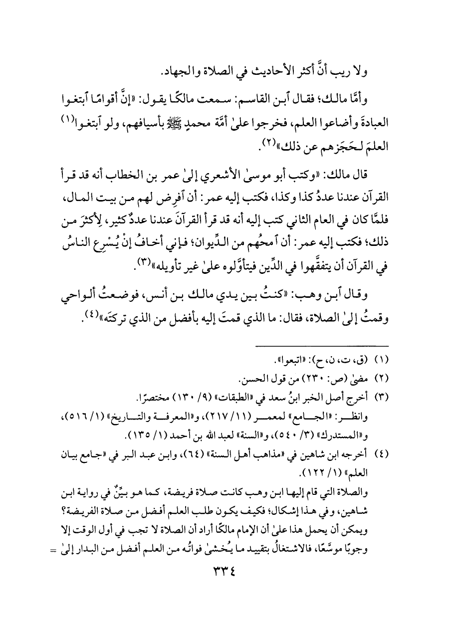 وقال ابن وهب: «كنتُ بين يدي مالك بن أنس، فوضعتُ ألواحي وقمتُ إلى الصلاة، فقال: ما الذي قمتَ إليه بأفضل من الذي تركتَه» (¬٤).