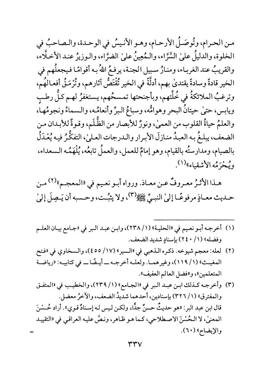 هذا الأثرُ معروفٌ عن معاذ. ورواه أبو نعيم في «المعجم» (¬٢) من حديث معاذٍ مرفوعًا إلى النبيِّ - صلى الله عليه وسلم - (¬٣)، ولا يثبُت، وحسبه أن يَصِلَ إلى