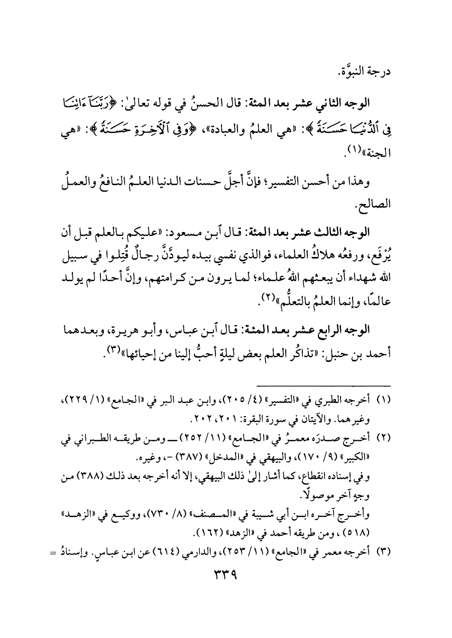 الوجه الثاني عشر بعد المئة: قال الحسنُ في قوله تعالى: {رَبَّنَا آتِنَا فِي الدُّنْيَا حَسَنَةً}: «هي العلمُ والعبادة»، {وَفِي الْآخِرَةِ حَسَنَةً}: «هي الجنة» (¬١).
