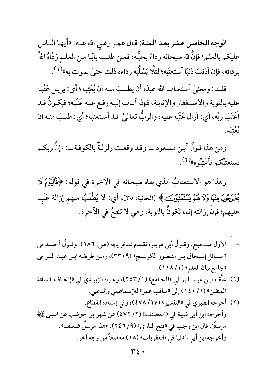 الوجه الخامس عشر بعد المئة: قال عمر رضي الله عنه: «أيها الناس عليكم بالعلم؛ فإنَّ لله سبحانه رداءً يحبُّه، فمن طلب بابًا من العلم رَدَّاهُ اللهُ بردائه، فإن أذنبَ ذنبًا استعتَبه؛ لئلَّا يَسْلُبه رداءه ذلك حتى يموت به» (¬١).