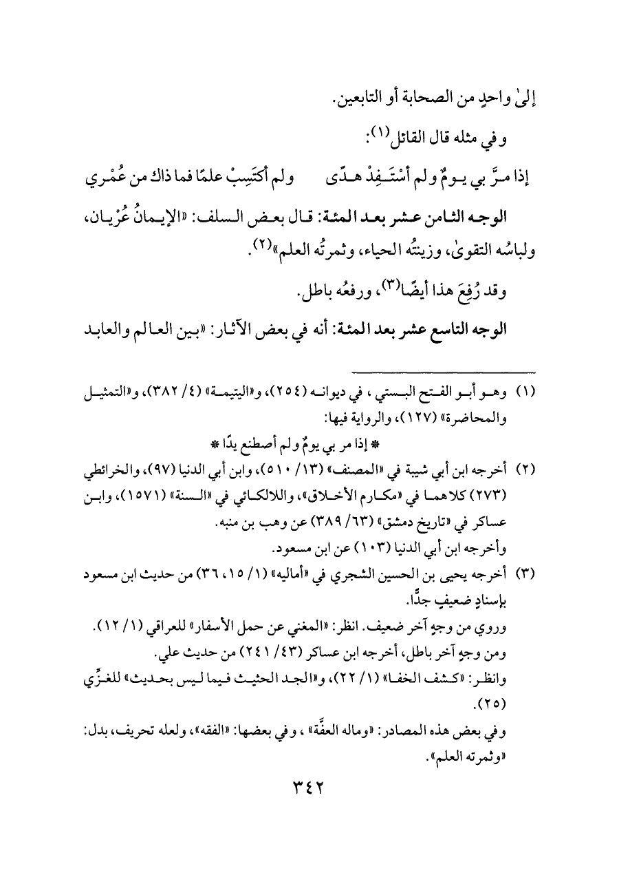 الوجه الثامن عشر بعد المئة: قال بعض السلف: «الإيمانُ عُرْيان، ولباسُه التقوى، وزينتُه الحياء، وثمرتُه العلم» (¬٢).