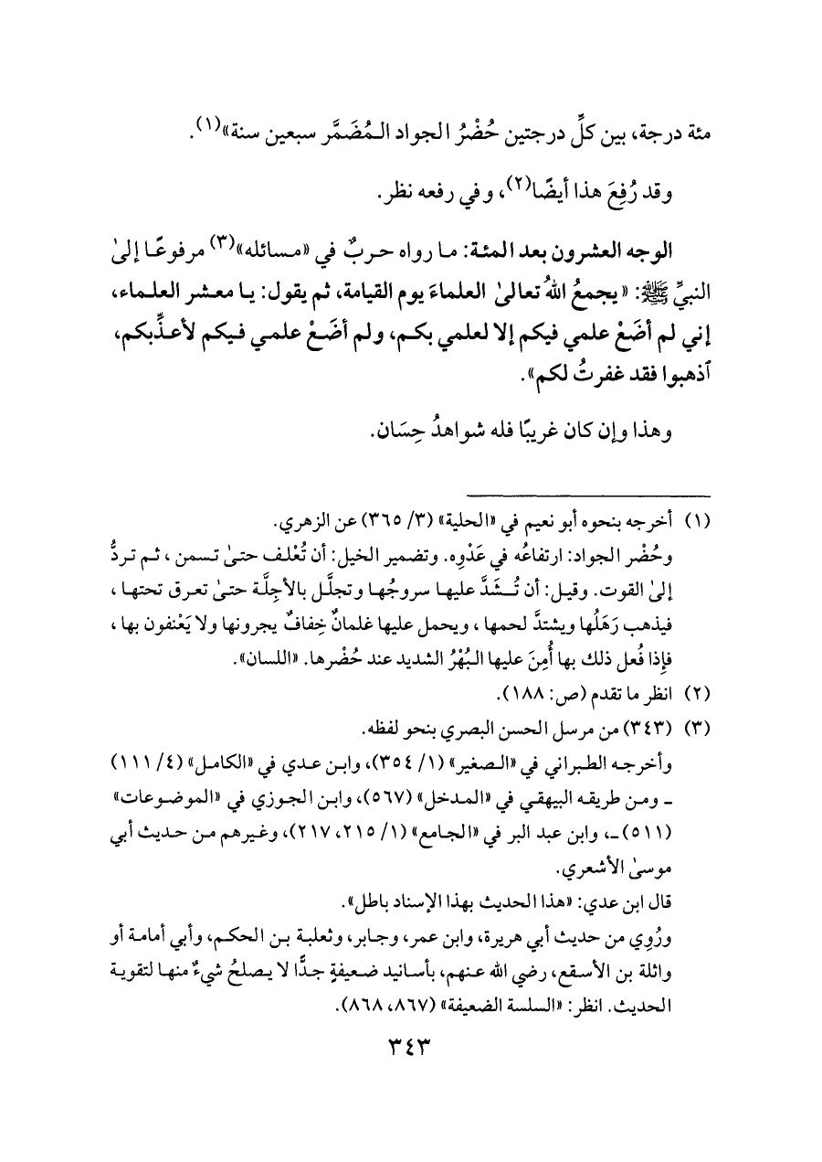 الوجه العشرون بعد المئة: ما رواه حربٌ في «مسائله» (¬٣) مرفوعًا إلى النبيِّ - صلى الله عليه وسلم -: «يجمعُ اللهُ تعالى العلماءَ يوم القيامة، ثم يقول: يا معشر العلماء، إني لم أضَعْ علمي فيكم إلا لعلمي بكم، ولم أضَعْ علمي فيكم لأعذِّبكم، اذهبوا فقد غفرتُ لكم».
