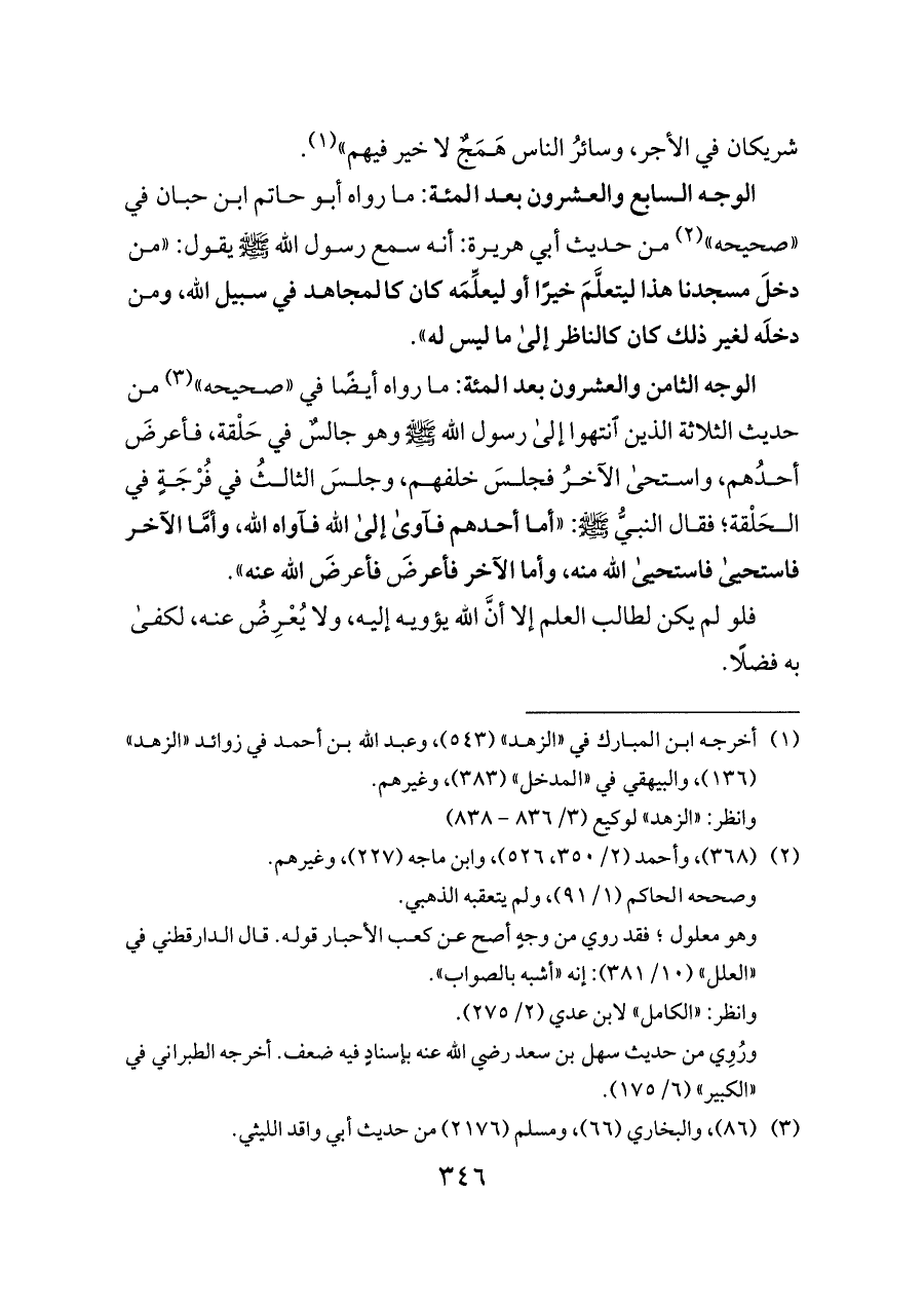من حديث أبي هريرة: أنه سمع رسول الله - صلى الله عليه وسلم - يقول: «من دخلَ مسجدنا هذا ليتعلَّمَ خيرًا أو ليعلِّمَه كان كالمجاهد في سبيل الله، ومن دخلَه لغير ذلك كان كالناظر إلى ما ليس له».