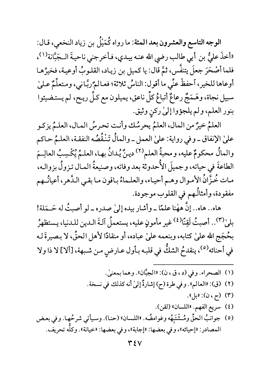 الوجه التاسع والعشرون بعد المئة: ما رواه كُمَيْلُ بن زياد النخعي، قال: «أخذَ عليُّ بن أبي طالب رضي الله عنه بيدي، فأخرجني ناحيةَ الجَبَّانة (¬١)، فلما أصْحَرَ جعلَ يتنفَّس، ثمَّ قال: يا كميل بن زياد، القلوبُ أوعية، فخيرُها أوعاها للخير، احفظْ عنِّي ما أقول: الناسُ ثلاثة؛ فعالمٌ ربَّاني، ومتعلِّمٌ على سبيل نجاة، وهَمَجٌ رعاعٌ أتباعُ كلِّ ناعق، يميلون مع كلِّ ريح، لم يستضيئوا بنور العلم، ولم يلجؤوا إلى ركنٍ وثيق.