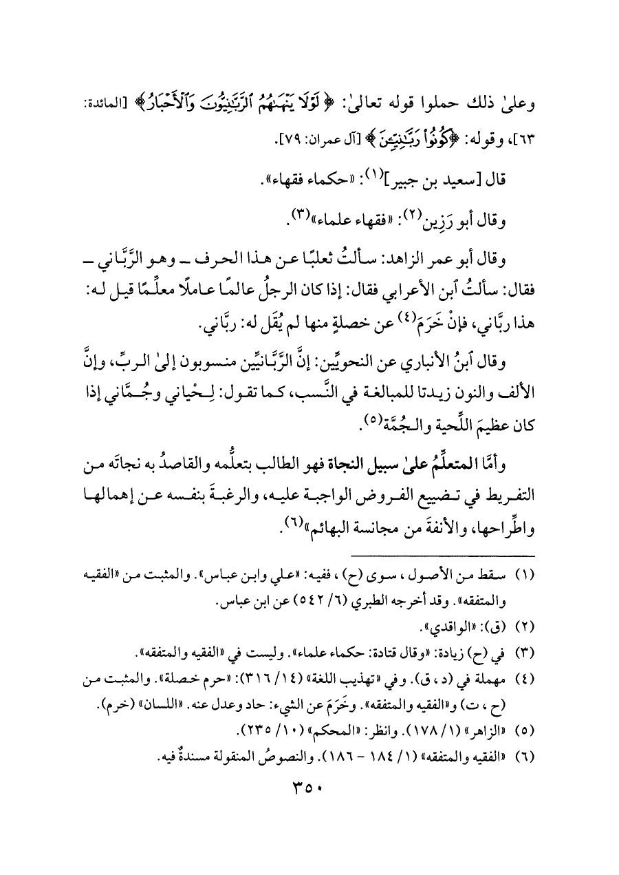 وعلى ذلك حملوا قوله تعالى: {لَوْلَا يَنْهَاهُمُ الرَّبَّانِيُّونَ وَالْأَحْبَارُ} [المائدة: ٦٣]، وقوله: {كُونُوا رَبَّانِيِّينَ} [آل عمران: ٧٩].