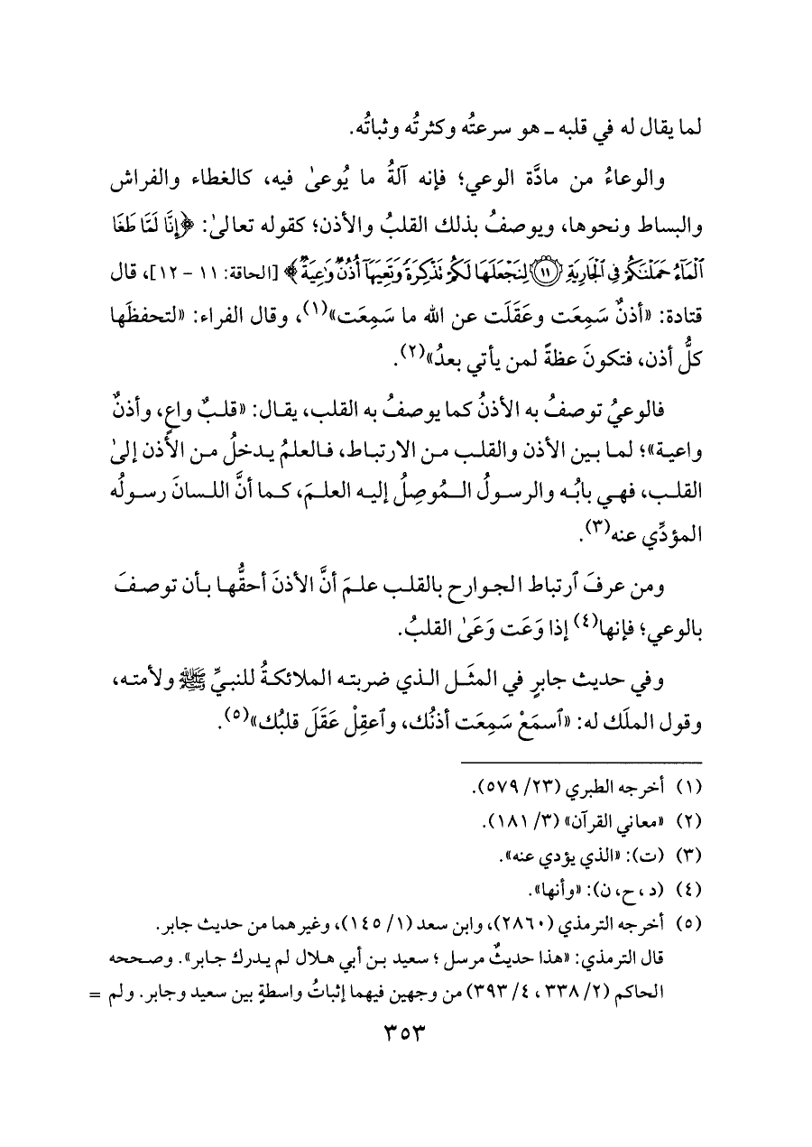 فالوعيُ توصفُ به الأذنُ كما يوصفُ به القلب، يقال: «قلبٌ واعٍ، وأذنٌ واعية»؛ لما بين الأذن والقلب من الارتباط، فالعلمُ يدخلُ من الأذن إلى القلب، فهي بابُه والرسولُ المُوصِلُ إليه العلمَ، كما أنَّ اللسانَ رسولُه المؤدِّي عنه (¬٣).