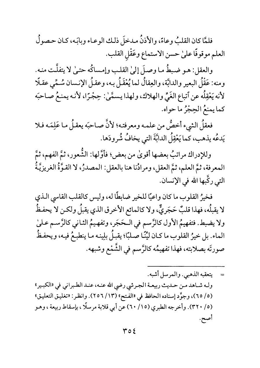 فخيرُ القلوب ما كان واعيًا للخير ضابطًا له، وليس كالقلب القاسي الذي لا يقبلُه، فهذا قلبٌ حَجَريٌّ، ولا كالمائع الأخرق الذي يقبلُ ولكن لا يحفظُ ولا يضبط. فتفهيمُ الأول كالرَّسم في الحَجَر، وتفهيمُ الثاني كالرَّسم على الماء. بل خيرُ القلوب ما كان ليِّنًا صلبًا؛ يقبلُ بلِينه ما ينطبعُ فيه، ويحفظُ صورتَه بصلابته، فهذا تفهيمُه كالرَّسم في الشَّمْع وشبهه.