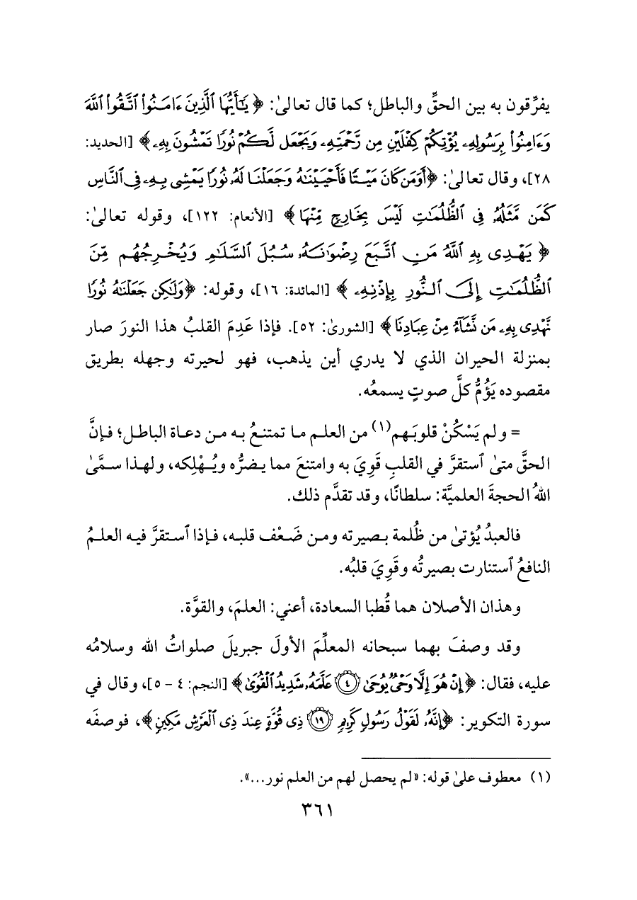 = ولم يَسْكُنْ قلوبَهم (¬١) من العلم ما تمتنعُ به من دعاة الباطل؛ فإنَّ الحقَّ متى استقرَّ في القلبِ قَوِيَ به وامتنعَ مما يضرُّه ويُهْلِكه، ولهذا سمَّى اللهُ الحجةَ العلميَّة: سلطانًا، وقد تقدَّم ذلك.