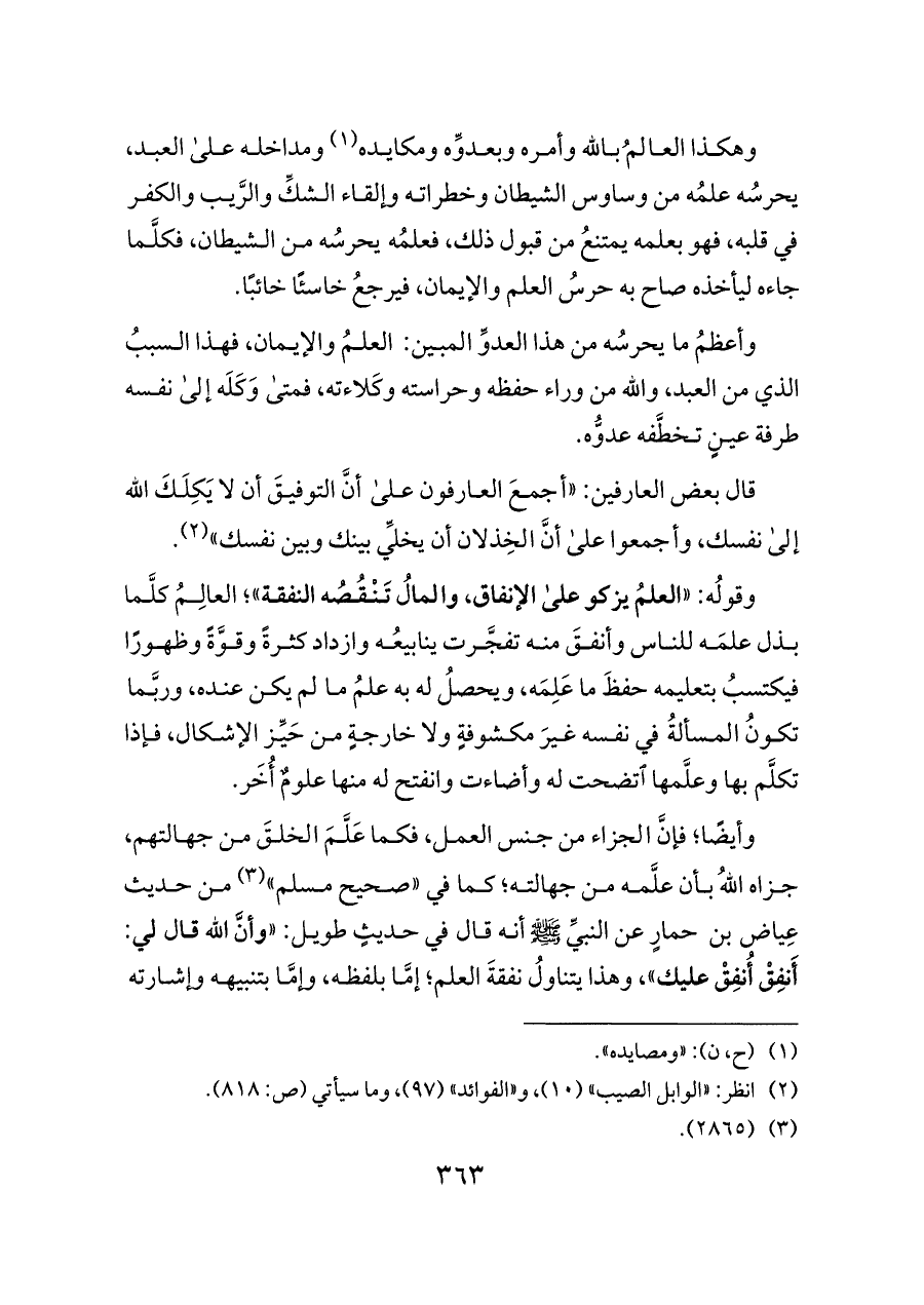 وأيضًا؛ فإنَّ الجزاء من جنس العمل، فكما عَلَّمَ الخلقَ من جهالتهم، جزاه اللهُ بأن علَّمه من جهالته؛ كما في «صحيح مسلم» (¬٣) من حديث عِياض بن حمارٍ عن النبيِّ - صلى الله عليه وسلم - أنه قال في حديثٍ طويل: «وأنَّ الله قال لي: أَنفِقْ أُنفِقْ عليك»، وهذا يتناولُ نفقةَ العلم؛ إمَّا بلفظه، وإمَّا بتنبيهه وإشارته