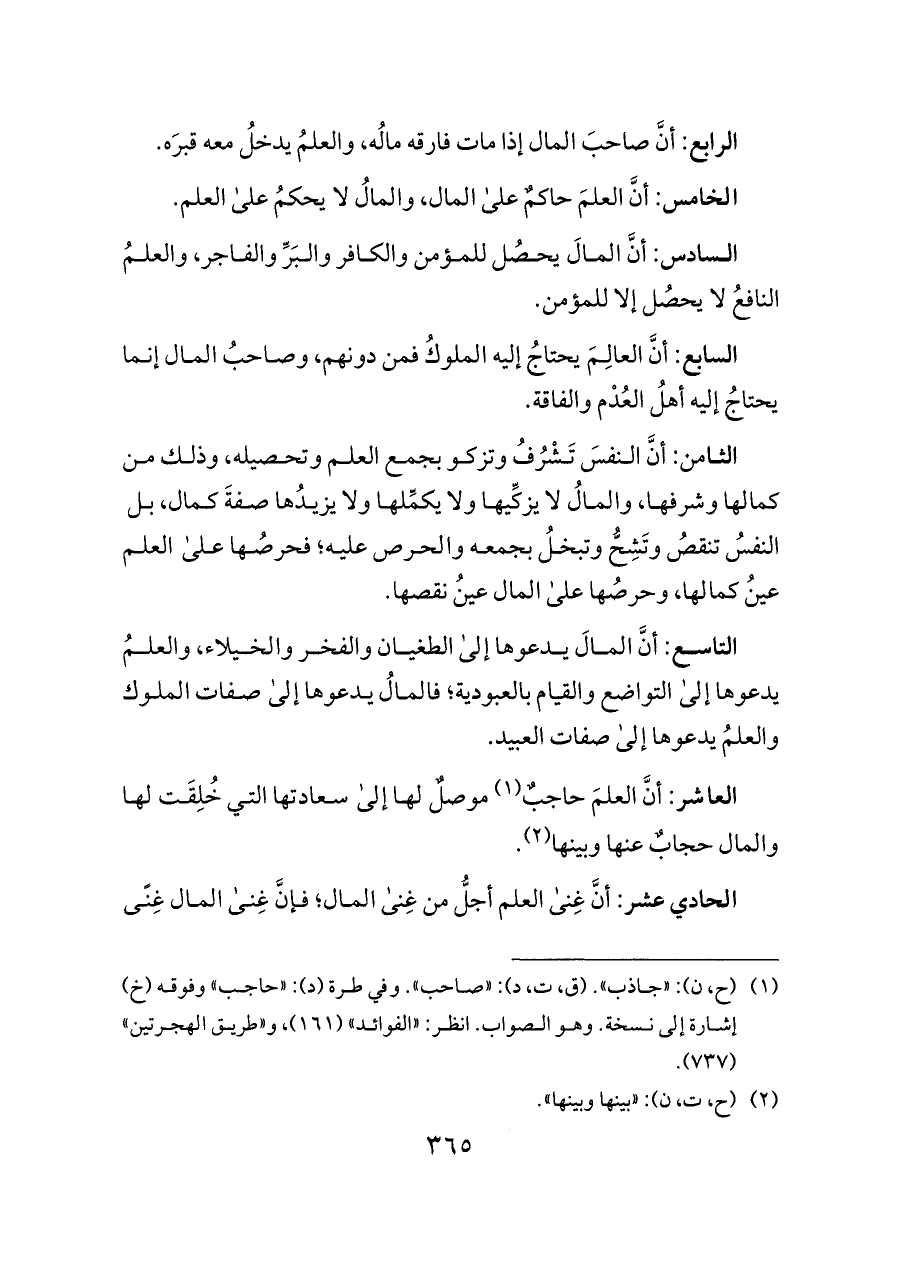 العاشر: أنَّ العلمَ حاجبٌ (¬١) موصلٌ لها إلى سعادتها التي خُلِقَت لها والمال حجابٌ عنها وبينها (¬٢).