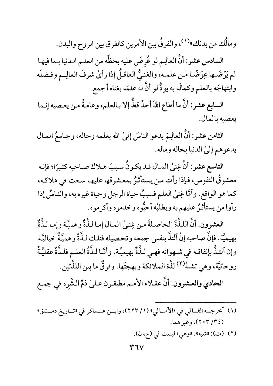 العشرون: أنَّ اللذَّةَ الحاصلةَ من غِنى المال إما لذَّةٌ وهميَّة وإما لذَّةٌ بهيميَّة. فإنَّ صاحبه إنْ التذَّ بنفس جمعه وتحصيله فتلك لذَّةٌ وهميَّةٌ خياليَّة وإن التذَّ بإنفاقه في شهواته فهي لذَّةٌ بهيميَّة. وأمَّا لذَّةُ العلم فلذَّةٌ عقليَّةٌ روحانيَّة، وهي تشبهُ (¬٢) لذَّة الملائكة وبهجتَها. وفرقٌ ما بين اللذَّتين.
