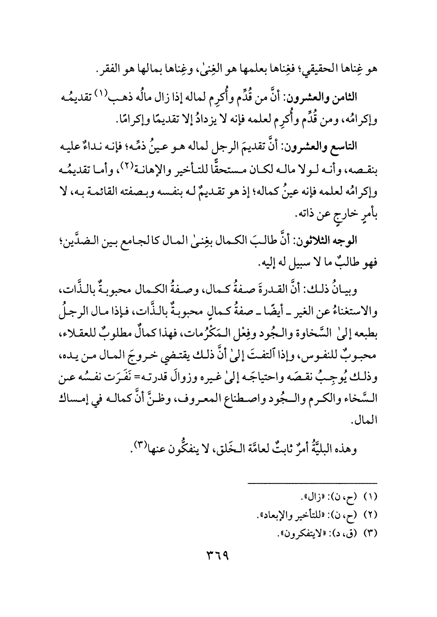 وبيانُ ذلك: أنَّ القدرةَ صفةُ كمال، وصفةُ الكمال محبوبةٌ بالذَّات، والاستغناءُ عن الغير ــ أيضًا ــ صفةُ كمالٍ محبوبةٌ بالذَّات، فإذا مال الرجلُ بطبعه إلى السَّخاوة والجُود وفِعْل المَكْرُمات، فهذا كمالٌ مطلوبٌ للعقلاء، محبوبٌ للنفوس، وإذا التفتَ إلى أنَّ ذلك يقتضي خروجَ المال من يده، وذلك يُوجِبُ نقصَه واحتياجَه إلى غيره وزوالَ قدرته= نَفَرَت نفسُه عن السَّخاء والكرم والجُود واصطناع المعروف، وظنَّ أنَّ كماله في إمساك المال.