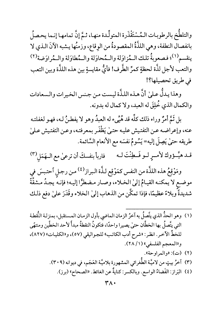والتلطُّخ بالرطوبات المُسْتَقْذَرة المتولِّدة منها، ثمَّ إنَّ تمامها إنما يحصلُ بانفصال النطفة، وهي اللذَّةُ المقصودةُ من الوِقاع، وزمنُها يشبه الآنَ الذي لا ينقسم (¬١)؛ فصعوبةُ تلك المُزاوَلة والمُحاوَلة والمُطاوَلة والمُراوَضة (¬٢) والتعب لأجل لذَّة لحظةٍ كمرِّ الطَّرف! فأيُّ مقايسةٍ بين هذه اللذَّة وبين التعب في طريق تحصيلها؟!